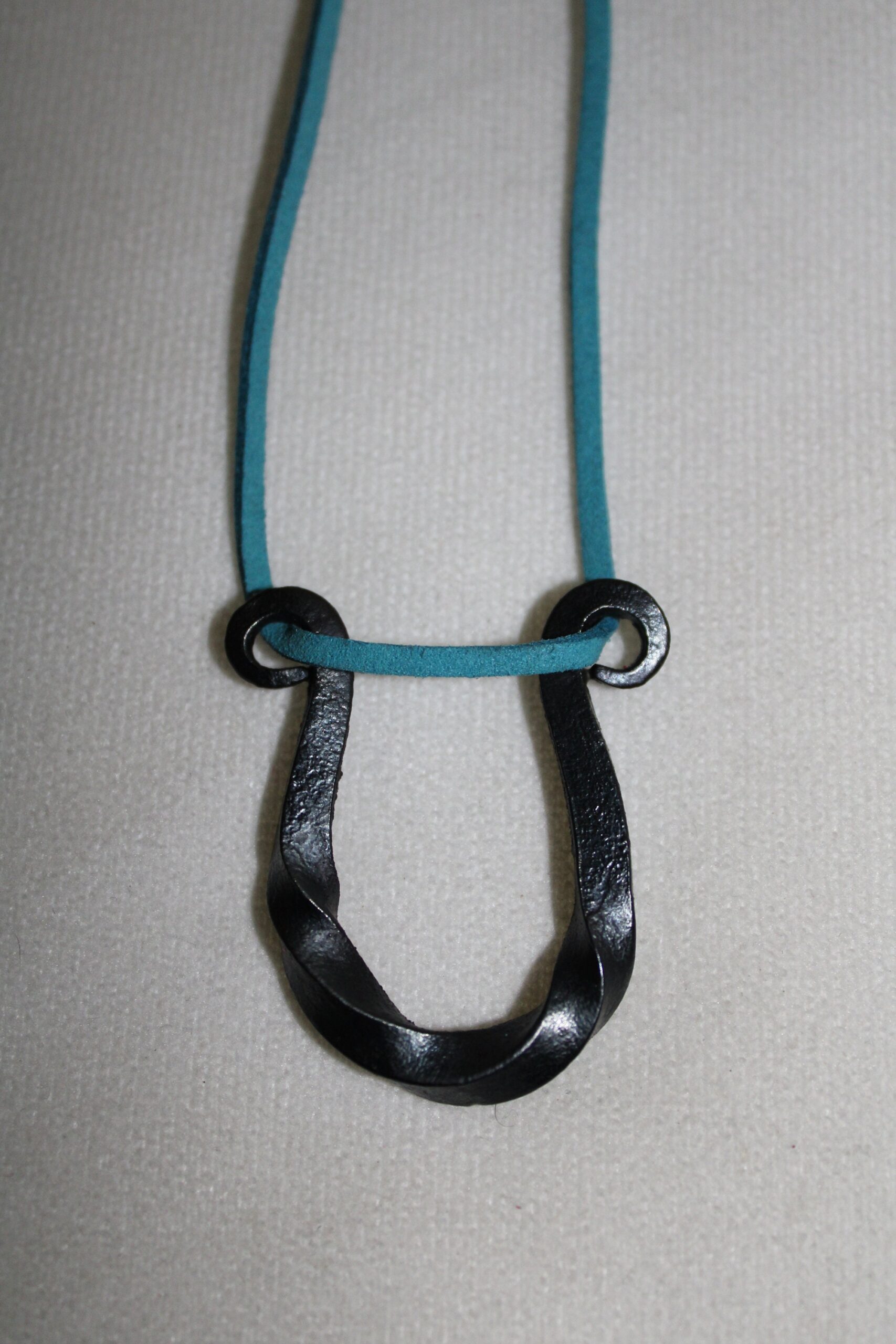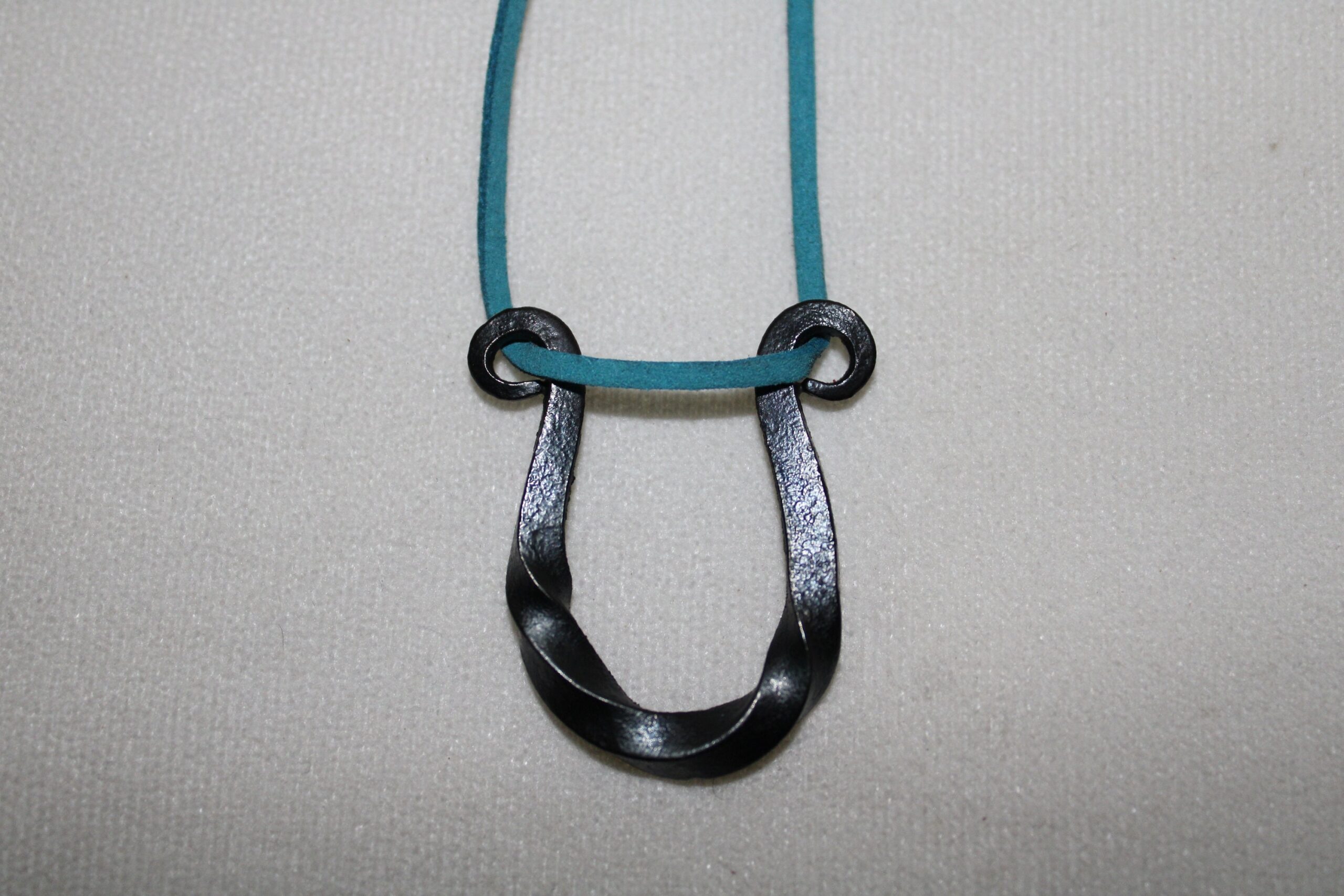 A delicate hand crafted twisted Horseshoe steel pendant on a suede necklace.